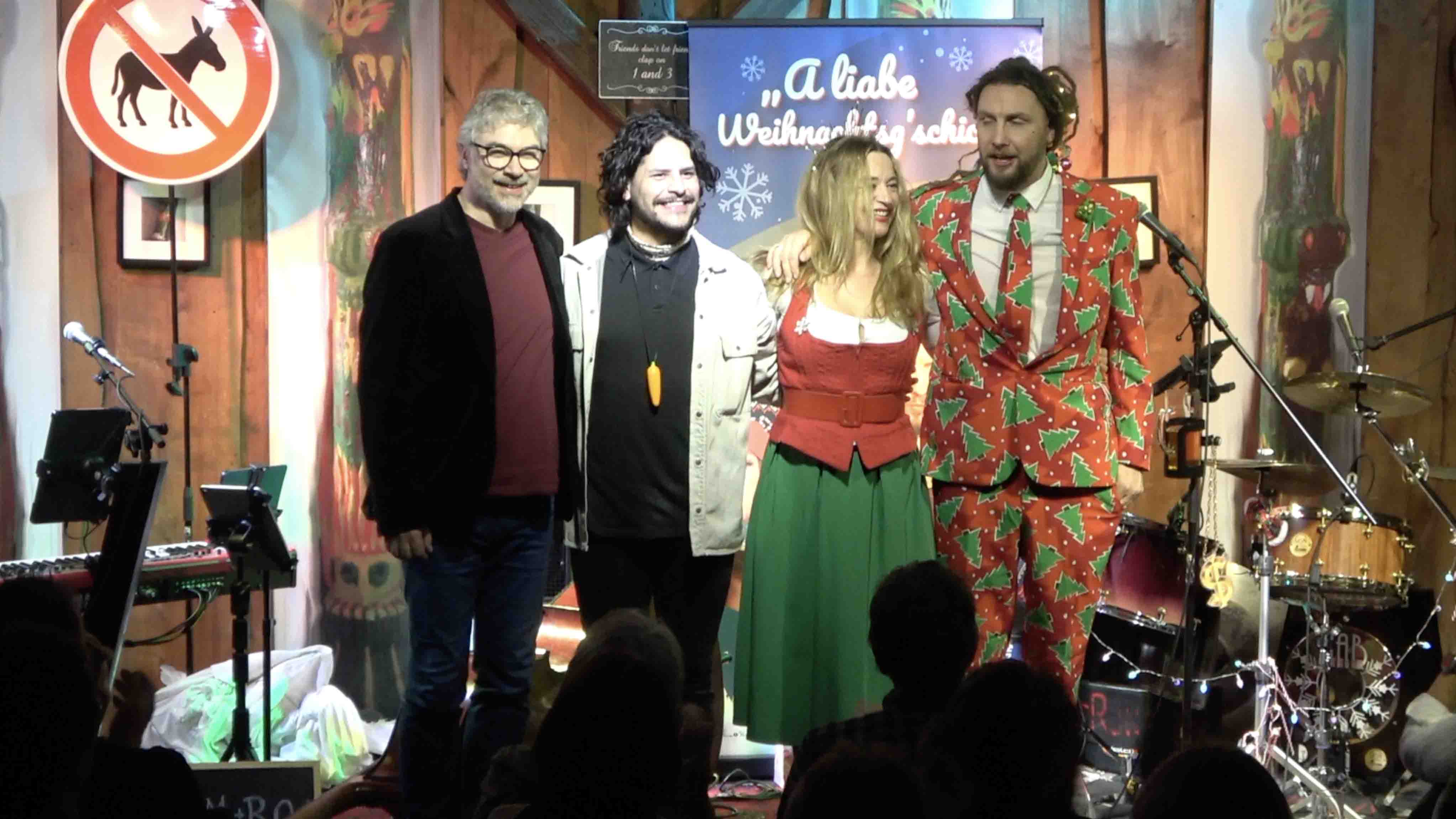 Oberweiling – Saisonabschluss und absoluter Höhepunkt in der Kneipenbühne: Am Samstag präsentierte das Quartett „L.I.A.B. (Lost In A Bar)" seine „Liabe Weihnachtsg’schicht‘“ und erntete am Ende Standing Ovations. Im nahezu ausverkauften Klassenzimmer feuerten die vier sympathischen Routiniers eine musikalische Rakete nach der anderen ab – bunt, vielfältig, wundervoll anzuhören – ein unvergleichlicher Genuss. Dabei waren Kasperl (mit dem Wurzelgemüse), Melchior (mit dem Highrauch) und Baltimore (der Gangstarapper mit dem gestohlenen Gold). Dazwischen gab es viele überraschende Gimmicks: der hervorragende Kontrabassist Felipe Andrade brillierte ebenso als Jesuskind „Jesi“ (mit Kasperls Mohrrübe als Schnuller) wie als futuristischer Erzengel Gabriel; die großartige Sängerin Ulla Niedermeier bediente ein altes Grammophon mit Originalaufnahmen aus dem Jahr anno Domini 0, der hervorragende Keyboarder Ray Mohra ließ ChatGPT zu Wort kommen und Andy Kuhn, Schlagzeuger höchster Güte, fungierte als witziger Erzähler in dem rundum stimmigen „Singspiel“, in dem auf äußerst vergnügliche Weise Ewigkeitshits aus dem Bereich Popmusik in die Weihnachtsgeschichte eingebunden wurden. Traumhaft schön war dabei auch der dreistimmige Gesang: Ekstase vorprogrammiert!